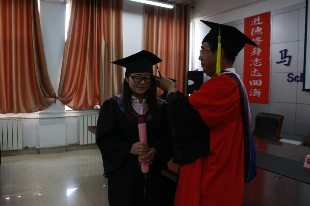毕业典礼在雄壮的国歌声中拉开序幕,教授委员会委员、教师代表、毕业生代表、在校生代表分别进行了发言。发言结束后行拨穗礼,学院雎密太教授为毕业生拨冠正穗。同时,学院副书记为考取研究生的同学颁发纪念品,希望他们不忘初心,继续前进。接下来的宣誓环节由毕业生代表胡彦琪同学作为领誓人,带领全体毕业生庄严宣誓。最后毕业生向学院赠送礼物,大家合影留念,毕业典礼圆满落下帷幕。